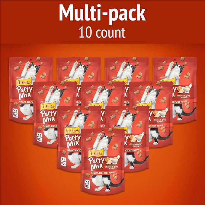 Purina Friskies Cat Treats, Party Mix Gravy-licious Crunch Chicken and Gravy Flavors - (Pack of 10) 2.1 oz. Pouches