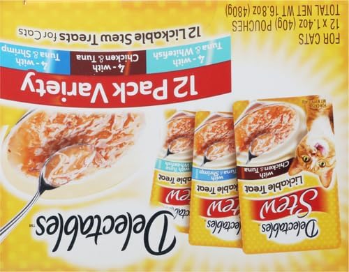 - CONTAINS: This pack of Delectables Stew contains twelve (12) 1.4-ounce lickable cat treats.