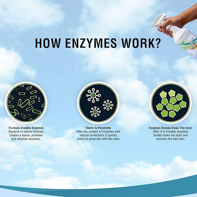 - ENZYMATIC FORMULATION - When you apply our product, eco-friendly in the formula creates lipase, protease and amylase enzymes. GreenFist solution breaks down the stains with enzymes featuring natural surfactants that quickly penetrates the stained area. This powerful formula takes 3-5 minutes to completely breakdown the stain using enzymes in the solution.Enzyme Based Formula Which Helps To Remove Stains Effectively Including, etc.