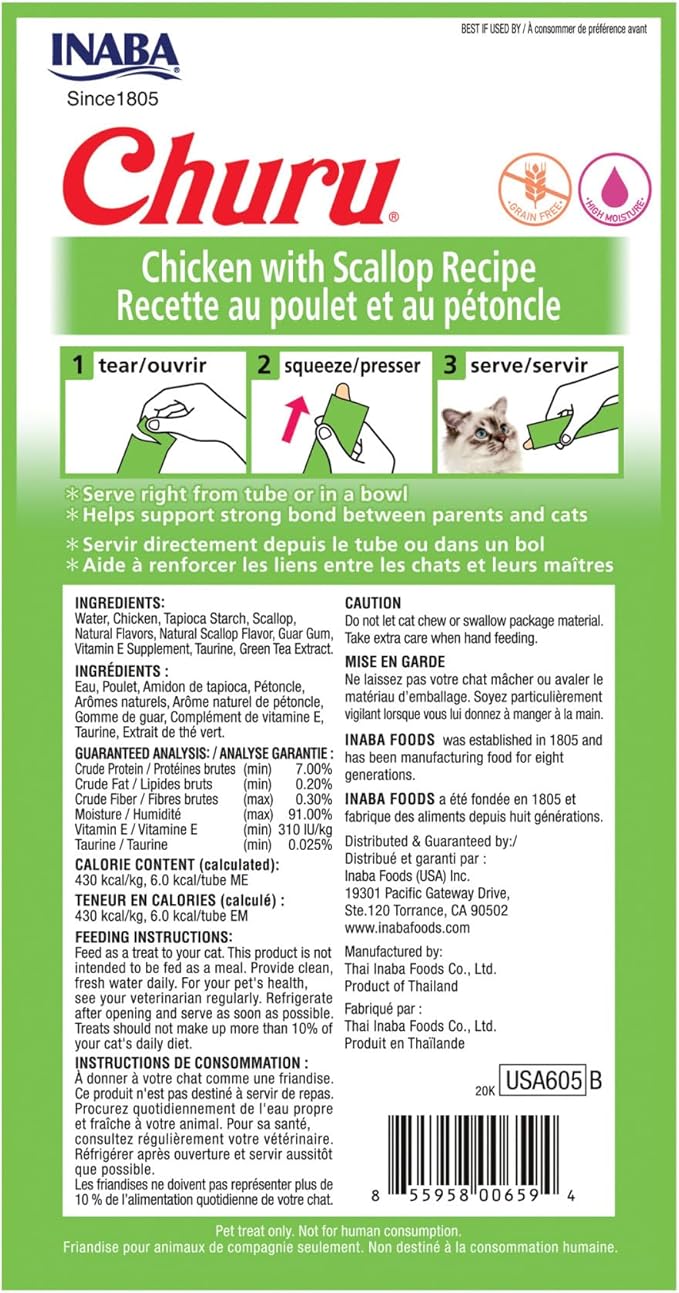 INABA Churu Cat Treats, Grain-Free, Lickable, Squeezable Creamy Purée Cat Treat/Topper with Vitamin E & Taurine, 0.5 Ounces Each Tube, 24 Tubes (4 per Pack), Chicken with Scallop Recipe