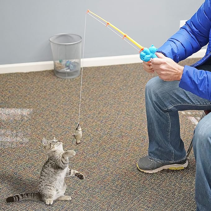 - REEL IN EXCITEMENT!: Your kitties are gonna flip, pounce, catch, and scratch for hours over this Cat Fishing Pole Toy. Get that camera ready, this Fishing Pole Cat Toy will provide hours of Funny Cat fun