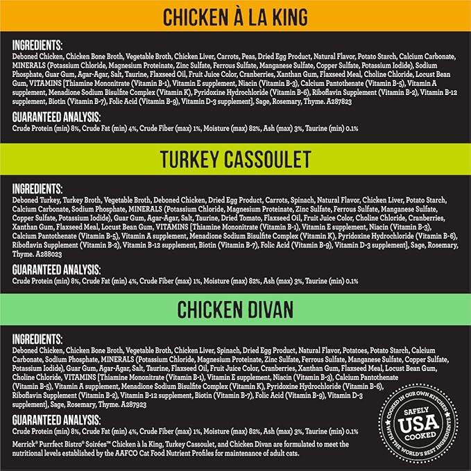 - Merrick Purrfect Bistro Soirees Variety Pack, Turkey Cassoulet, Chicken Divan, And Chicken a la King Recipes With Gravy. Grain Free Premium Natural Cat Food With Added Vitamins, Minerals And Nutrients