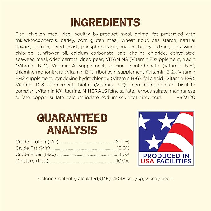 - Friskies cat treats made with real fish as the first ingredient and two calories per treat