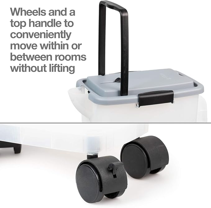 - STORE & POUR (TM): Wheels & top handle to conveniently move within or between rooms. Adjustable spout to increase or decrease litter pour speed. Large rear ‘teapot’ handle makes refilling your litter box easy.