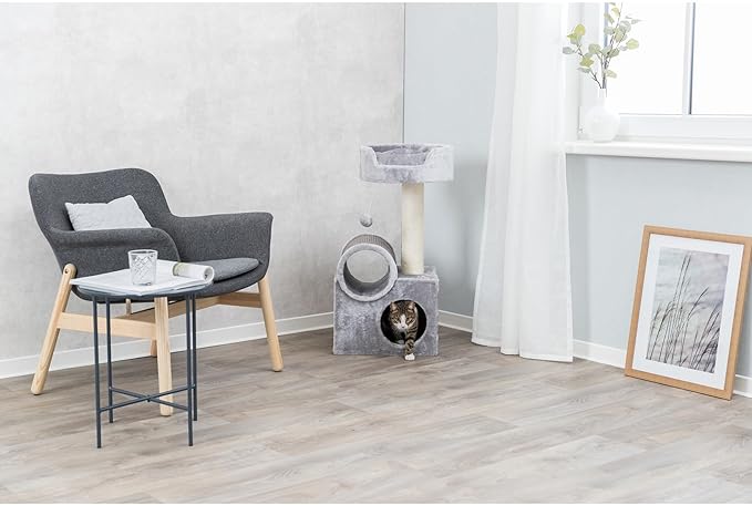 TRIXIE Tolar Cat Scratching Post 31.5 Inch - with Durable Sisal Rope and Tunnel, Condo, Platform with Removable Cushion & Dangling Cat Toy - in Gray