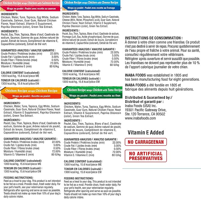 - TWICE THE TEXTURE: Each pillow-shaped bite starts with a soft baked chicken paste with no grains, preservatives, carrageenan or artificial colors. Then we've filled the centers with Inaba's delicious Churu filling to give your pup two types of texture