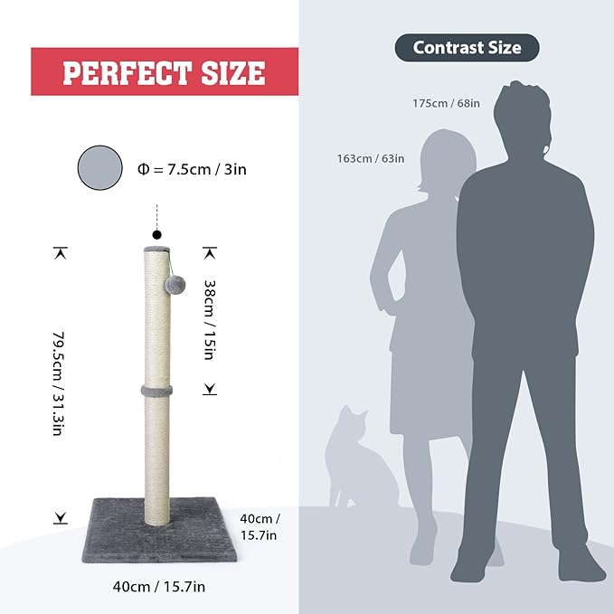 - FIT FOR THE MOST CATS - The 31 inch high scratching post gives cats of most ages and sizes a suitable place to scratch. Thorough covering of the sisal around the post and soft plush material on the base and top platform, it can satisfy your cat's scratching and climbing instincts.