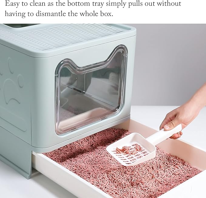 - FOLDABLE DESIGN: The litter box has a foldable design and all parts can be removed. Simply fold the other parts into the bottom drawer, then close the lid and put them away to save space