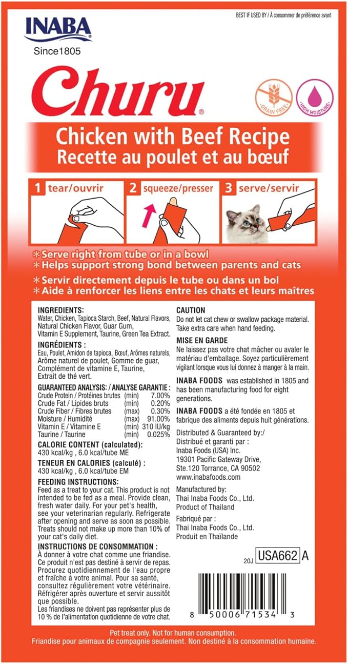 INABA Churu Cat Treats, Grain-Free, Lickable, Squeezable Creamy Purée Cat Treat/Topper with Vitamin E & Taurine, 0.5 Ounces Each Tube, 24 Tubes (4 per Pack), Chicken with Beef Recipe