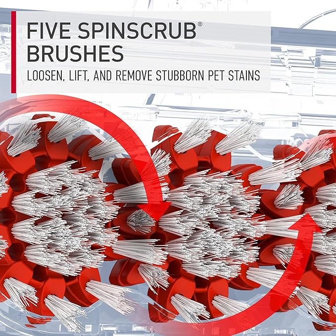 - FIVE SPINSCRUB BRUSHES: Stubborn pet stains and embedded dirt are no match for the five counter-rotating SpinScrub brushes that scrub at multiple angles to loosen, lift, and remove even the toughest stains for a lasting clean