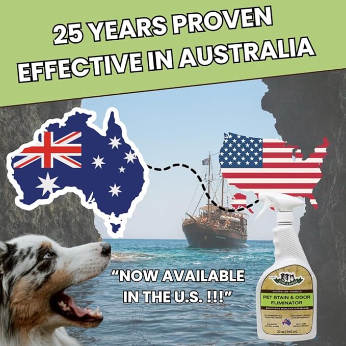 - AUSSIE MAGIC: Down under, they know a thing or two about clean living! With a 25-year history in Australia, our spray for animals has earned its stripes as a trusted solution for pet messes. It’s like bringing a slice of the Aussie outback into your home, as our cat and dog odor eliminator leaves behind a fresh scent that'll make you feel like you're in a cozy cabin retreat. Embrace the essence of the Australia with every spritz of our pet urine stain spray.