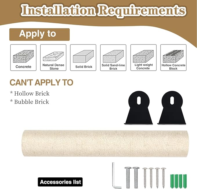 - High Quality Material: The kitten scratcher is made from safe sisal in solid construction with high-quality iron mounting brackets, very stout and stable, avoid wobbling, provides reliability and stability.to withstand all active scratchings of your cats