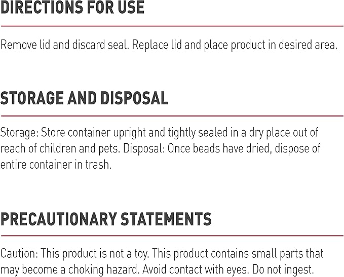 - APPLICATION: Simply remove the lid and discard the seal. Replace the lid and place the gel beads in desired areas around your home. Discard when beads are dry.