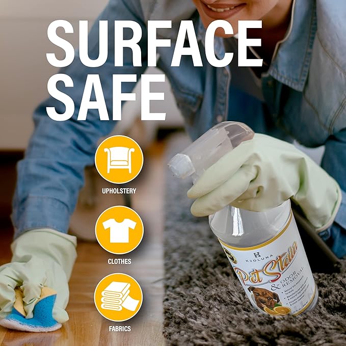 - You Can Use It Anywhere – KJOLUNA Stain and Odor remover is safe to use anywhere! Use it on clothes, pet kennels, dog runs and carriers. Even furniture, carpet and hard floors. Unfortunately our pets sometimes just don’t make it outside.