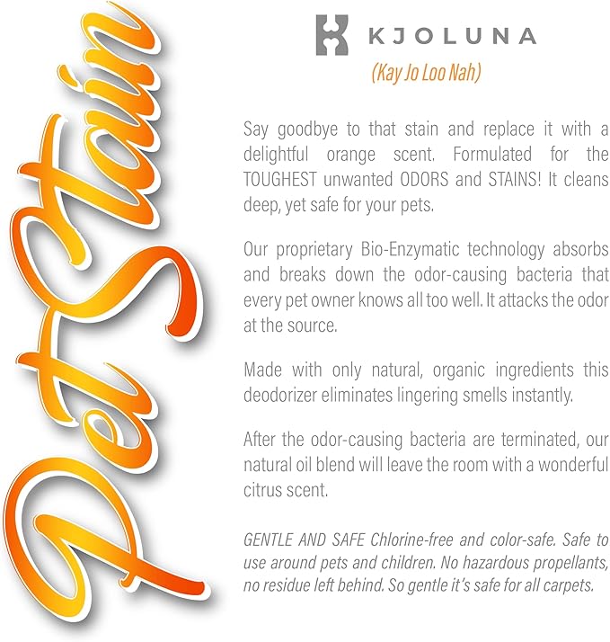 - Stain & Odor Eliminator for your home –When your pet leaves a stain in your home this will get rid of it. Whether its vomit, urine or feces KJOLUNA professional strength formula is perfect for any job.
