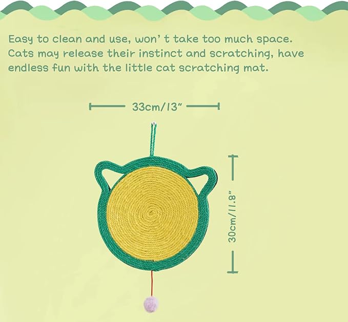- Material: Made of durable natural sisal which is strong enough to resist the sharpest claws for a fair enough long time. Sisal rope is dyed with plant dyes, chemical free, tasteless and non-toxic.