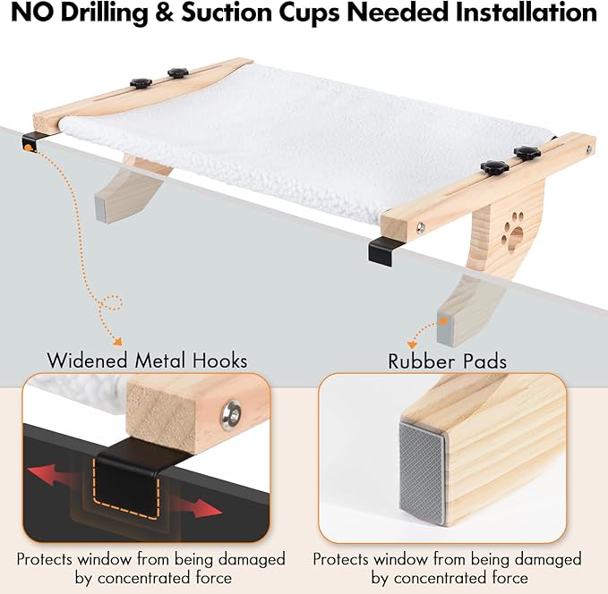 - No Drilling& Suction Cups Needed For Installation:This cat bed is fixed on the carrier by two metal hook and supported by two wooden supports, without the need to damage the wall and the worry of the suction cups falling off. The metal hooks are widened. The contact surface with the windowsill is larger that protects your window from being damaged by the concentrated force.