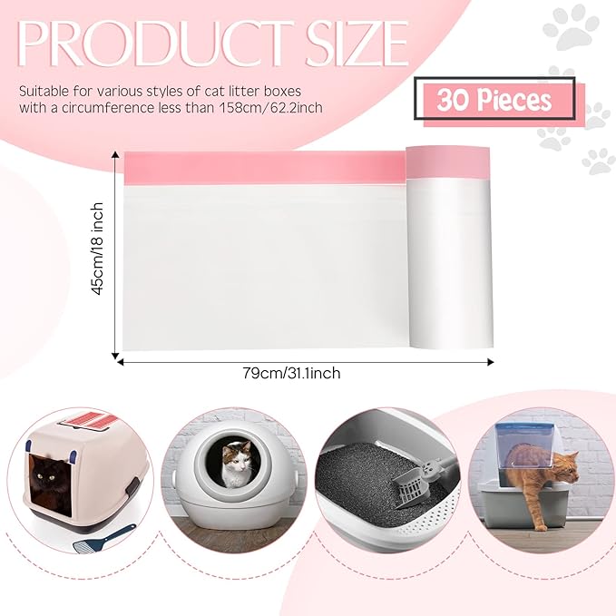 - Package Includes: you will get 30 pieces cat litter box liners, each measures about 79 x 45 cm/ 31 x 18 inches, suitable for cat litter boxes with a circumference less than 62.2 inches/ 158 cm, and ample quantity is enough to meet your pet's daily use and replacement needs