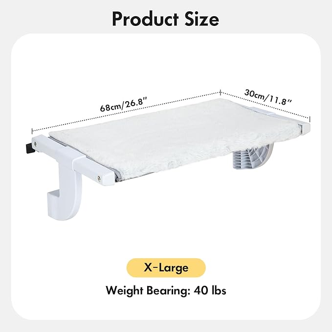 - Stable Structure for Great Comfort & Safety: The support frame is connected by two hard metal straight pipes, making the whole perch extremely strong and solid, can holds up to 40lbs. The product dimension of the medium size is 22.8''x11.8'', the large size is 24.4''x11.8'' and the x-large size is 26.8''x11.8'', suitable for cats of all size.