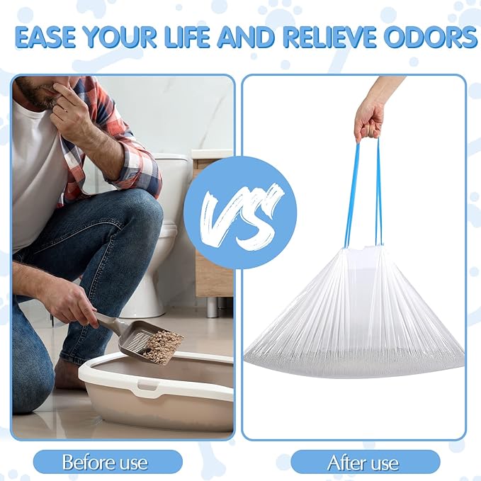 - Drawstring Design: these cat litter bags adopt drawstring design, which are convenient to operate, you just need to grab the strap and lift them, and these bags will tighten automatically, which ensure that the litter will not spill and stain your litter box