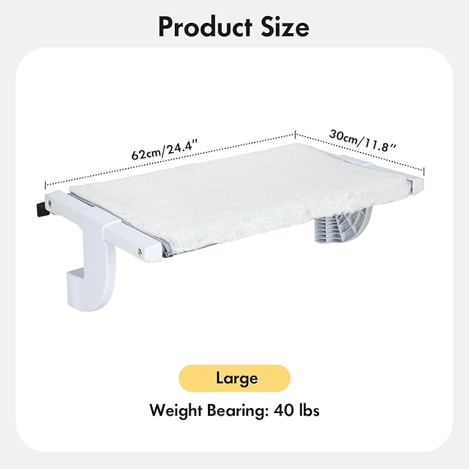 - Stable Structure for Great Comfort & Safety: The support frame is connected by two hard metal straight pipes, making the whole perch extremely strong and solid, can holds up to 40lbs. The product dimension of the medium size is 22.8''x11.8'', the large size is 24.4''x11.8'' and the x-large size is 26.8''x11.8'', suitable for cats of all size.