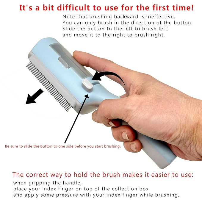 - 【【Pet dry cleaning and shedding brush】It's a bit difficult to use for the first time!You can only brush in the direction of the button. Slide the button to the left to brush left, and move it to the right to brush right.The correct way to hold the brush makes it easier to use: when gripping the handle, place your index finger on top of the collection box and apply some pressure with your index finger while brushing.