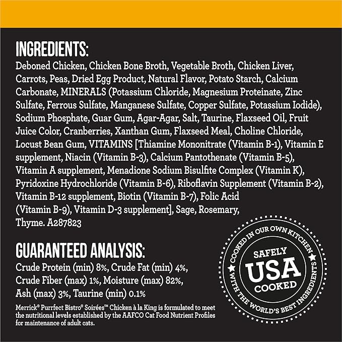 - Merrick Purrfect Bistro Soirees Chicken a la King With Gravy Recipe. Grain Free Premium Natural Cat Food With Added Vitamins, Minerals and Nutrients
