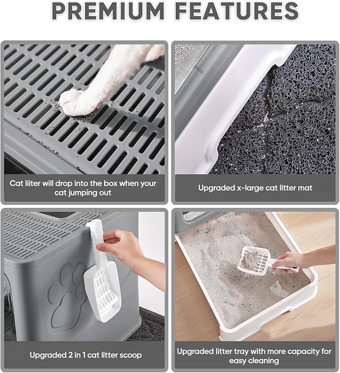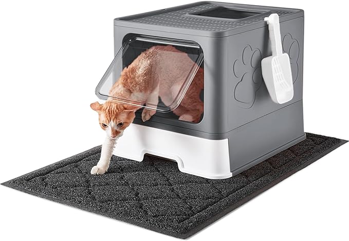 Cat Litter Box with X-Large Litter Mat and Scoop, Large Foldable Litter Box with Lid, Front Top Entry Exit Kitty Litter Box, Odor Control Easy Clean (Upgrade Dark Grey)