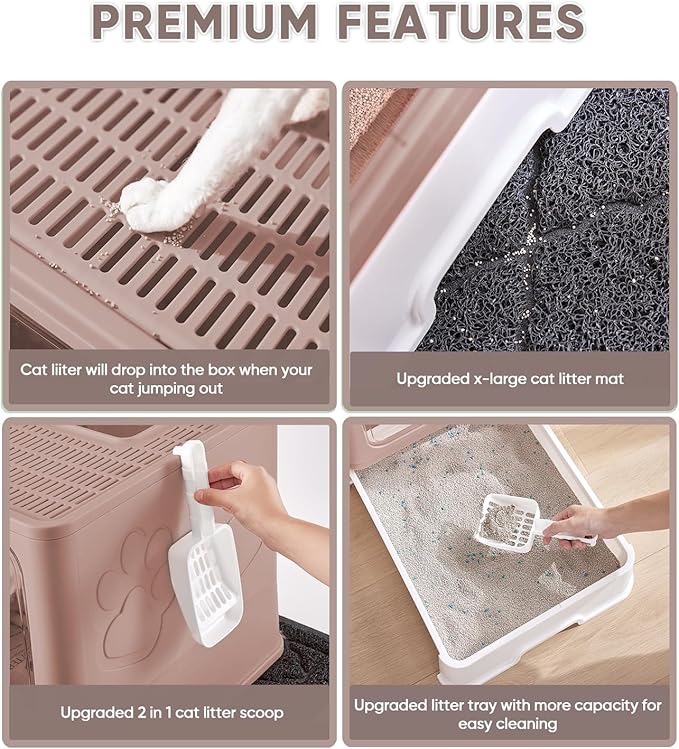 Cat Litter Box with X-Large Litter Mat and Scoop, Large Foldable Litter Box with Lid, Front Top Entry Exit Kitty Litter Box, Odor Control Easy Clean (Upgrade Coffee)