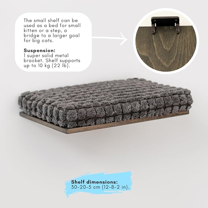 - Safety: Secure mounting of cat wall bed ensures your pet's safety while using the cat playground. Built to last, each floating cat shelf supports up to 55 lb (25 kg) and each small cat stair supports up to 22 lb (10 kg). The waved cat shelf dimension is 28*12*2 inches (70-30-5 cm). The small cat bridge dimensions is 12*8*2 inches (30-20-5 cm). The small staircase can be used as a cat bed for small kittens or a cat perch, a cat bridge to a larger goal for big cats.