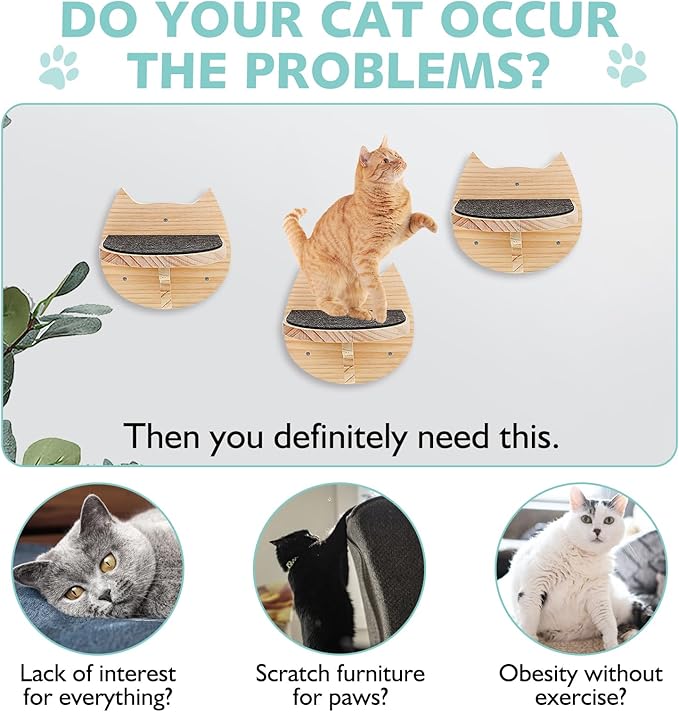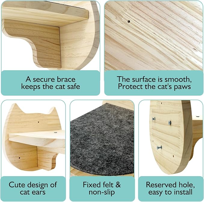 - [HIGH QUALITY MATERIAL] This cat wall step is very strong, because it is made of wood, the cat wall shelf and the bottom of the platform have reinforcement supports, screws and wall anchors make it so stable, in the use of the process is not easy to break, deformation, fade, no smell, burr; Polished smooth can protect the cat's PAWS, and the scratching pad is made of soft felt, the cat is very comfortable on it, the cat will like to play on it, you can also rest assured that the cat can use it
