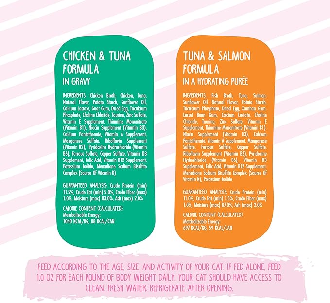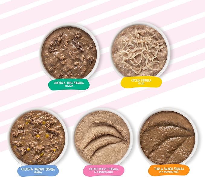 - A Variety Pack of Chicken & Pumpkin Pawsome Purrs!, Chicken Cha Cha Cha!, Chicken & Salmon Cuddle Buds!, and Chicken Cute To Boot