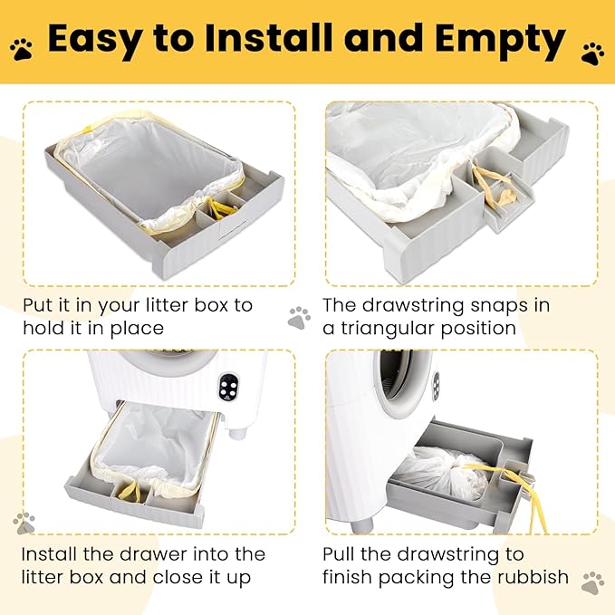 - Convenient Drawstring Design: The automatic cat litter box litter bags feature a practical drawstring closure, making it effortless to tie up and dispose of the waste without more spillage or mess.The drawstring design makes it easier to tie and carry, and can hold more trash. Simply pull and tie, no need for complicated knots.