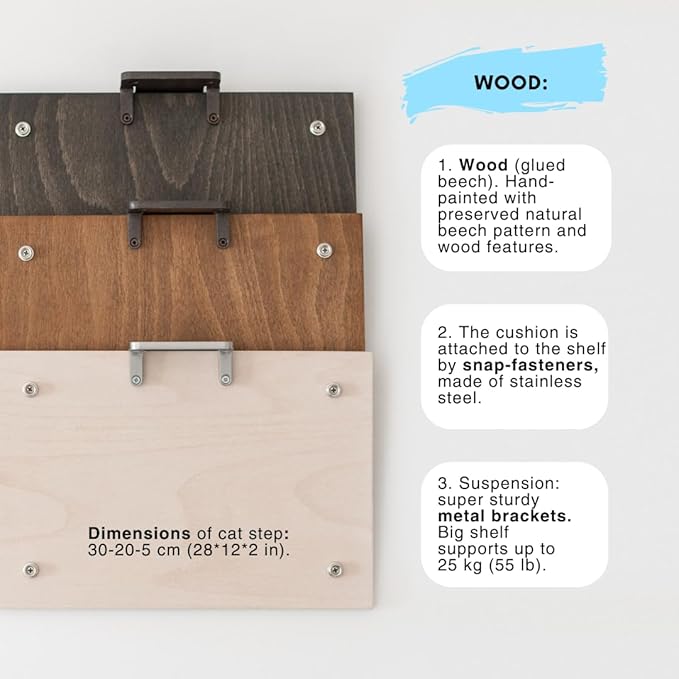- Craftsmanship: The step is made of beech wood (leafy beech). Please note that we paint each cat shelf by hand to preserve the craftsmanship of the product, the natural pattern of the beech and the natural characteristics of the wood. Wood Finish - Brown.