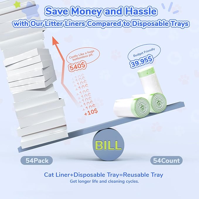 - Save Money: 54 pcs per box, for reusable trays, liner will keep the tray intact; For disposable tray, it prevents urine from leaking onto the floor and soaking the tray causing it to collapse, don't to replace disposable trays frequently, saving budget