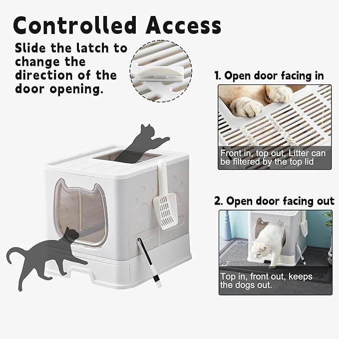 - Controllable Access Design: The door of the litter box can be slid to change the direction by sliding the latch, you can adjust it according to your cat's needs.