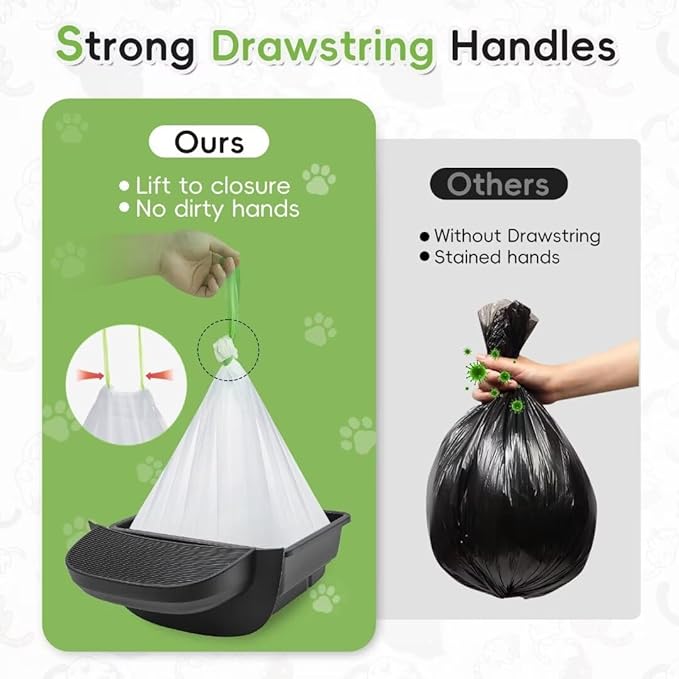 - 【Drawstring Closure Design】Tired of dealing with smelly hands when cleaning the litter box? Our Self-cleaning Cat Litter Box Liners with a strong drawstring handle make it a breeze to dispose of cat pop waste. Keep odors locked in and your hands clean as you effortlessly lift and discard the liner. Say hello to a simplified and hygienic litter-changing experience for both you and your cat.