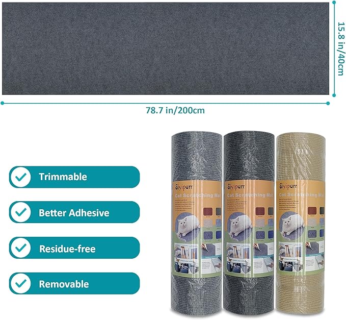 - 1. Cat scratch mat :Cat scratch furniture protector can be used on a variety of surfaces, such as wood, plastic, glass, concrete, leather and more.The cat scratching mat self-adhesive can be cut into any shape for use on cat shelves, wooden cat trees, cat towers, sofas or other furniture, making it a good protector and asisumption cat scratching mat board.Soft cat carpet remnants protects hardwood boards from scratches and provides good friction and comfort for cats to jump on.