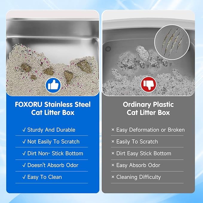 - 【Sturdy and Durable】 The FOXORU high wall cat litter box large is made of thickened stainless steel and a high-strength plastic enclosure, ensuring durability and stability, thus eliminating the need for frequent litter box replacements.