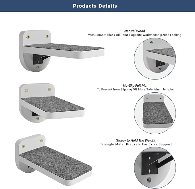 - PACK OF 3 WHITE CAT WALL STEPS: Solid natural wood platform is more strong and durable for use than market plywood or other wood, and surface with white oil painted is act better for weather resistance.