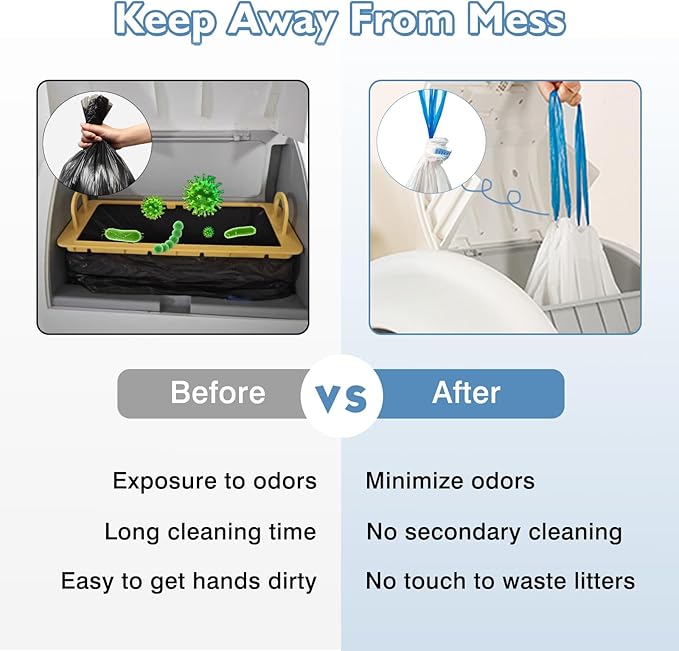 - DRAWSTRING DESIGN-These litter box waste bags features a reinforced and convenient drawstring closure to effectively prevent cat litter from exposing. You don't need to worry about getting your hands dirty. Just simply grab the drawstring and lift, allowing for waste disposal in few seconds.