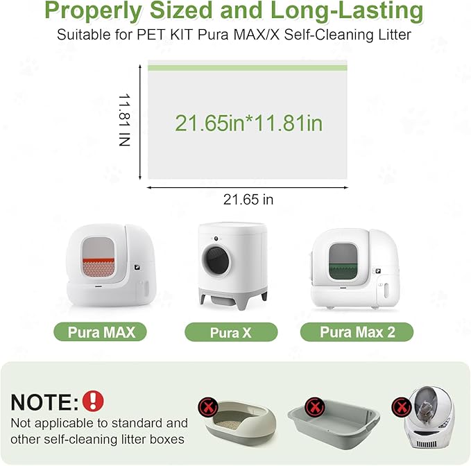 - PERFET MATCH: Included in the package are 120 cat litter box bags measuring 21.65" x 11.81", perfectly matching Pet Kit PuraX PuraMax/Cleanpe*thome cat litter machines. Friendly reminder: 1. Correct size matching helps the machine run smoothly. 2. Before purchasing, please measure the size of your cat litter box drawer.