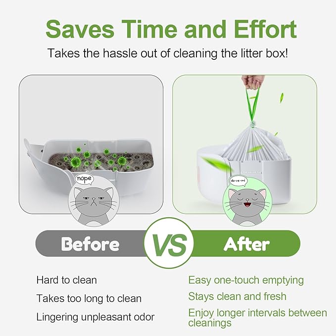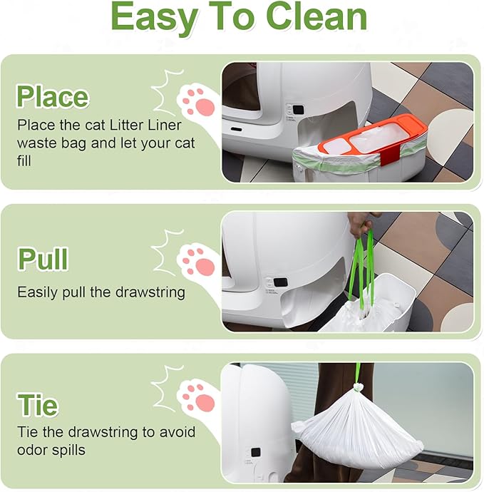 - NO ODOR AND NO DIRTY HANDS: Our automatic cat litter box liners come with a convenient drawstring closure to prevent litter spillage and odor leakage. Say goodbye to the messy cleaning process of cat urine or feces getting on your hands. Just pull and lift, and you can efficiently handle your cat's cleaning. Odor-free and touchless, that's Dranbol!