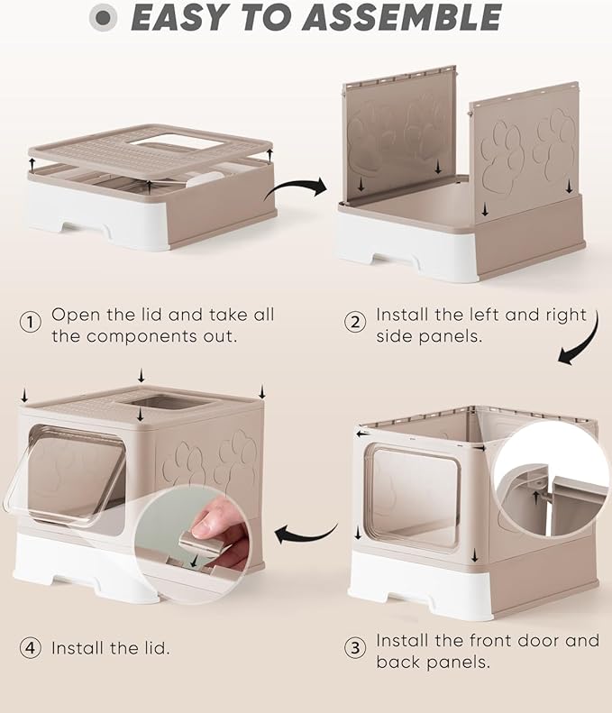 - Two-Way Entry and Exit Design: With an adjustable clip, you can control the door of the litter box to allow only entry or both entry and exit based on your cat's habits. When using the front entry and top exit mode, the hollowed lid effectively collects litter that cats may carry out when exiting from the top, keeping the surrounding area around the cat box clean