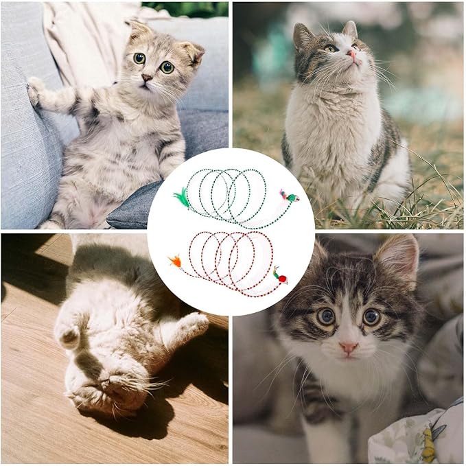 2pcs Cat Tunnels for Indoor Cat, S Type Folded Cat Tunnel Spring 10in Large Size Collapsible Spiral Cat Toy with Feather and Mouse Toy for Pet Puppy Kitten Interactive Exercise(Striped Green, Red)