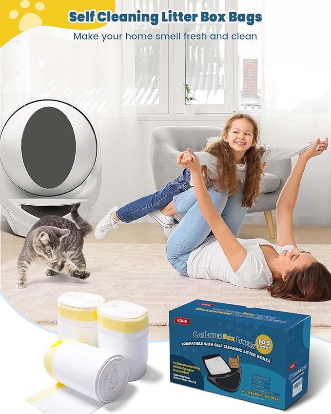 KONE 105 Count Cat Litter Bag Liners fits Robot 3 4 and most Self Cleaning Litter Drawer Waste Bin, 2 mil Thickened Drawstring Kitty Poop Bags, Automatic Pet Disposable Replacement Trash Bag, 26 x 16