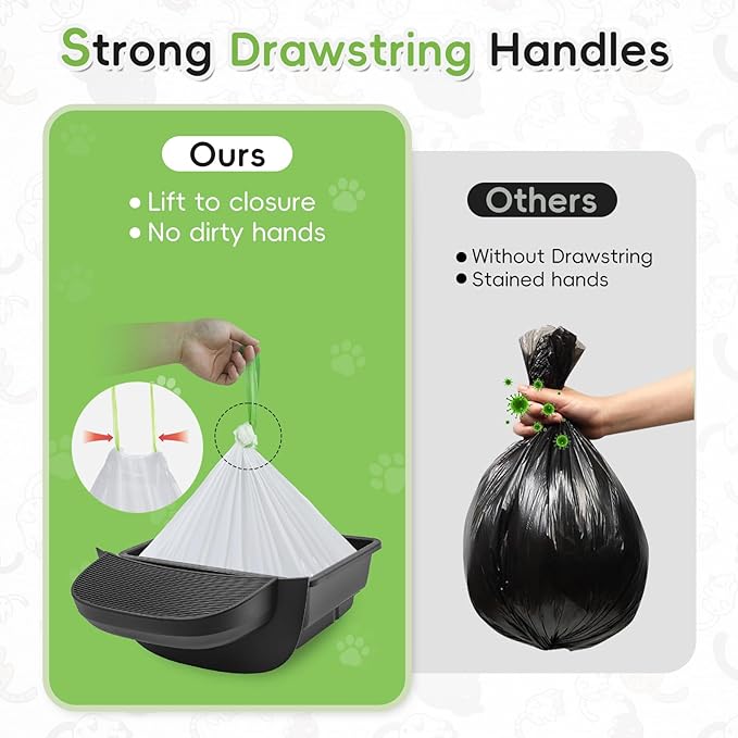 - 【Drawstring Closure Design】Tired of dealing with smelly hands when cleaning the litter box? Our Self-cleaning Cat Litter Box Liners with a strong drawstring handle make it a breeze to dispose of cat pop waste. Keep odors locked in and your hands clean as you effortlessly lift and discard the liner. Say hello to a simplified and hygienic litter-changing experience for both you and your cat.