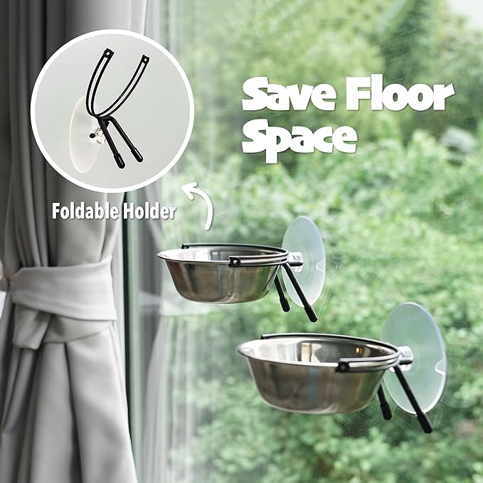 PETKARAY Window Cat Bowls, Cat Food Bowl for Window, Dog Proof Cat Feeding Station, Foldable Stainless Kitty Bowl 12 Ounces (Pack of 2)