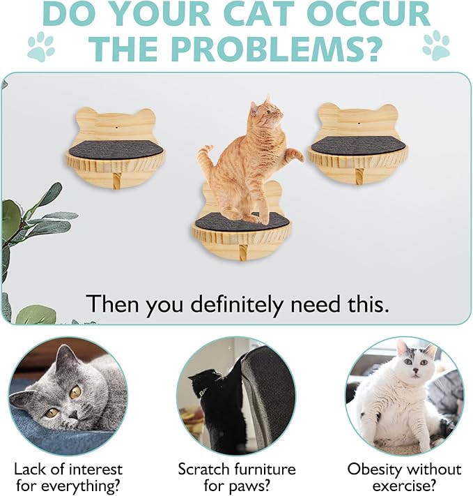 - [HIGH QUALITY MATERIAL] This cat wall step is very strong, because it is made of wood, the cat wall shelf and the bottom of the platform have reinforcement supports, screws and wall anchors make it so stable. Polished smooth can protect the cat's paws, and the scratching pad is made of soft felt, the cat is very comfortable on it