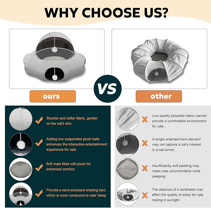 - Sturdy, Durable, Easy to Clean: Constructed from high-quality materials, our cat tunnel bed ensures durability and includes a soft inner pad for ultimate comfort. The removable inner bed is machine-washable for easy cleaning. Non-slip nails at the bottom secure the tunnel in place, providing a stable and comfortable space for your pet to relax and play.